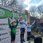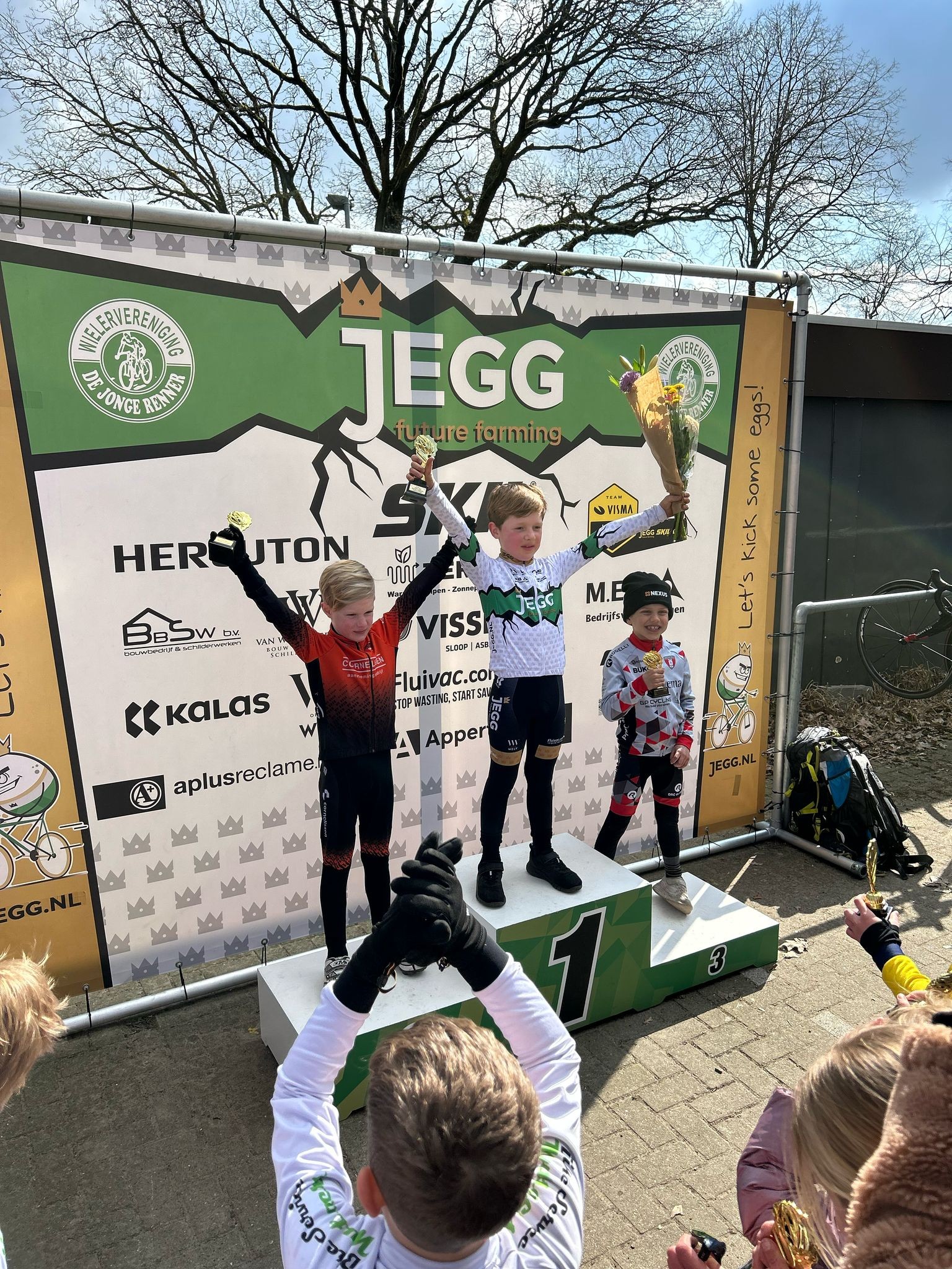 In categorie 3 waren Mees Broeken, Faas van Mook, Trisha Baah en Sam van Miert de kleppers die de koers kleur gaven in een veld met 23 vertrekkers. Faas en Sam zaten mee in de kopgroep met vijf concurrenten voor de prijzen. In het peloton deden Trisha en Mees wat er van ze verwacht werd. Faas had goede benen, parcourskennis en zag zijn kansen. ” Ik heb een paar keer geprobeerd te demarreren. In de laatste ronde zat ik met Sam even weg. Net na de laatste bocht werden we teruggepakt. Ik ben net na de boom de sprint aangegaan en kwam als 1e over de streep”, aldus een gelukkige Faas. Sam en Trisha eindigden ook op het podium want Sam finishte als derde jongen en Trisha als derde meisje. Mees zag zijn inspanningen beloond met een achtste plek bij de jongens.