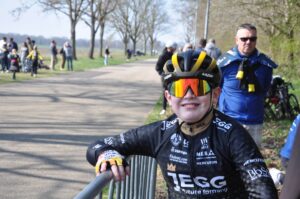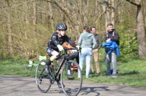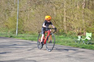 Voor Teun Hakkert was het zijn eerste officiële KNWU-wedstrijd. Ondanks een start achteraan wist hij zich snel naar voren te werken en reed zelfs een tijd op kop. Uiteindelijk finishte hij als 10e van de 28, een uitstekende prestatie én een waardevolle ervaring rijker.
