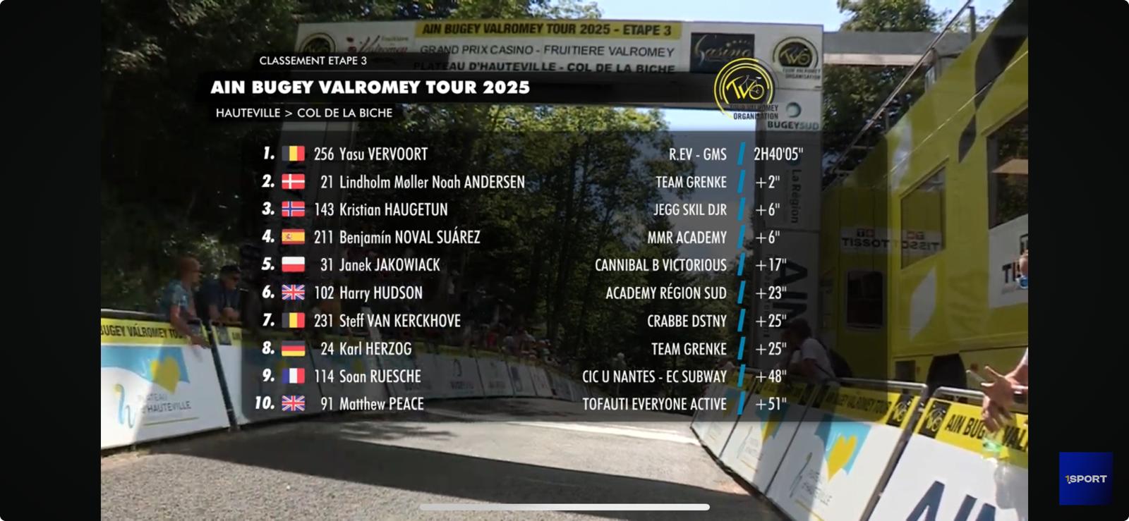 Kristian Haugetun de Noors junior van de internationale selectie van de Oosterhoutse wielerverenging JEGG-SKIL-DJR veroverde gisteren (12 juli) in de loodzware 3e etappe van de ‘ Ain Bugey Valromey’ (F) het brons. Deze rittenkoers in het Franse Alpenlandschap voor junioren over 497 kilometer, 8500 hoogtemeters en 29 wielerploegen bestaande uit 27 nationaliteiten werd inmiddels voor de 37e keer georganiseerd. Kristian won ook het bergklassement van deze etappe en veroverde daarmee de tweede plaats in het algemeen bergklassement. Zowel in het jongerenklassement als in het puntenklassement staat Kristian na deze etappe ook in deze twee klassementen op de tweede plaats. Met nog twee etappes te gaan op zondag en maandag waarin de junioren nog het nodige klimwerk te verteren krijgen zijn er kansen voor Kristian om een of meerdere klassementen te winnen.