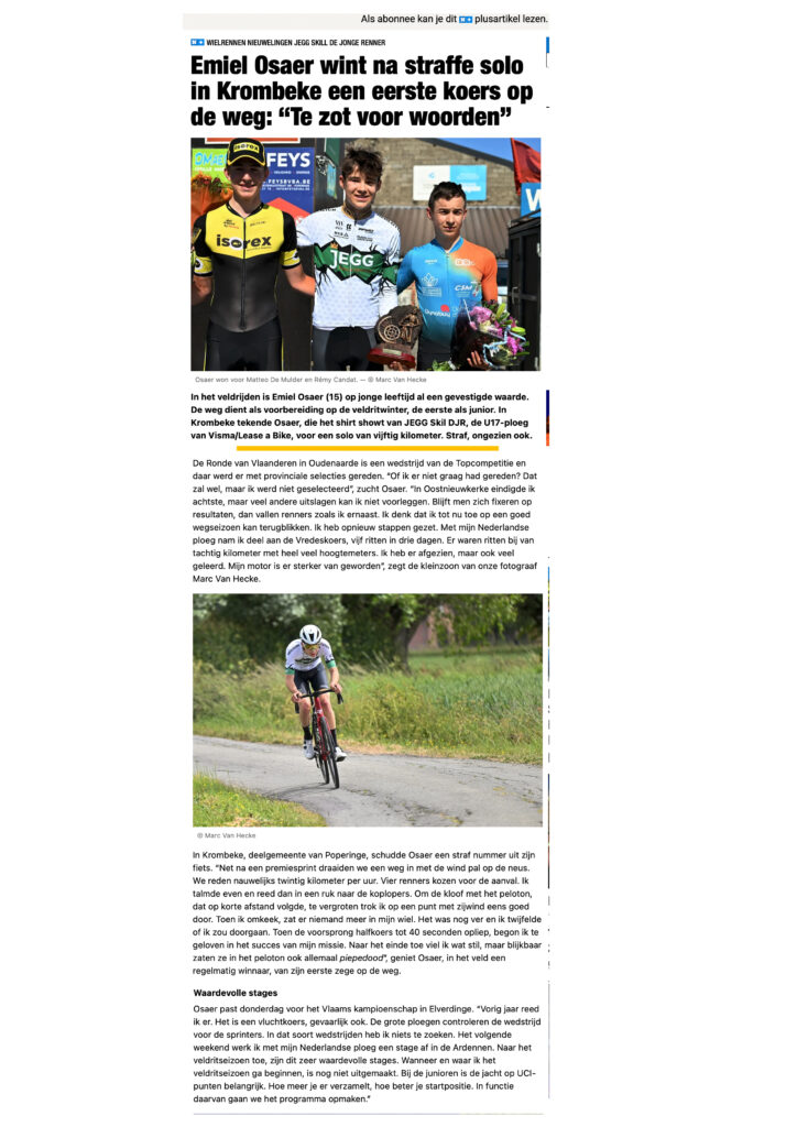 De kleppers van de nieuwelingen van de Oosterhoutse wielervereniging JEGG-SKIL-DJR wisten in de diverse koersen de prijzen te pakken. Zo ging afgelopen zaterdag Adne Cappon in Nijverdal als eerste over de meet en op zondag (25 mei) reed het Belgische toptalent van de Oosterhoutse wielervereniging, Emiel Osaer, in de Belgische Omloop van Krombeke, (U17) na een solo van 55 kilometer, met 2 minuten en 14 seconden voorsprong, naar de overwinning. Jeremy Bus was zaterdag 24 mei ook in goede doen en werd in de Kasseien Cup in Sittard naar de 2e plaats en Jens de Vaan finishte als nummer 7 in de top tien. Voor Adne Cappon was de zege in Nijverdal zijn derde zege in een week.