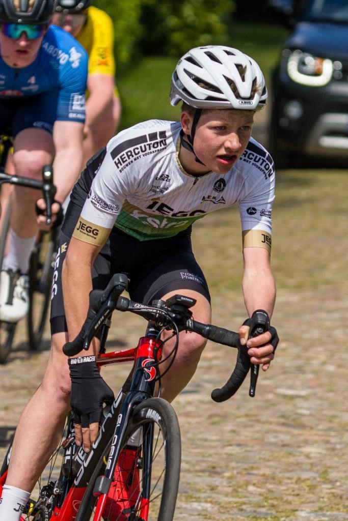In de TCJ Omloop door het Land van Bartje reden de nieuwelingen van JEGG-DJR Academy zich net niet in de top twintig. In in Gieten startte JEGG-DJR Academy met 6 nieuwelingen (= U17). Dat waren; Loek Graafmans, Nick Koenis, Lars van Oord, Bob Overdevest, Aron van Vught en Ties Wagenaar. De wedstrijd kenmerkte zich door het bochtige parkoers, de rode klinkers en een korte Drentse kiezelstrook. Na twintig kilometer reed Nick lek en helaas had de neutrale wagen geen passend wiel voor onze renner. Teleurgesteld moest Nick de strijd staken. Aron sloot na een valpartij weer terug aan bij de hoofdmacht maar moest later de weer lossen. Ties maakt duidelijk grote stappen op dit moment en wist zich lange tijd prominent voorin het peloton te handhaven. Loek Graafmans beet zich vast in het ‘elastiek’ en wist in deze zware rit de finish weer te halen ging bij de 1e jaars nieuwelingen als 21e over de meet.